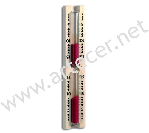 Ampulheta com protecção em madeira e escala de 0 a 15 minutos.